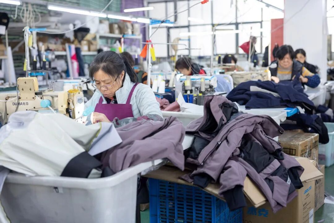 ▲浙江嘉兴,一家雪服企业的工人正在赶制新款雪服