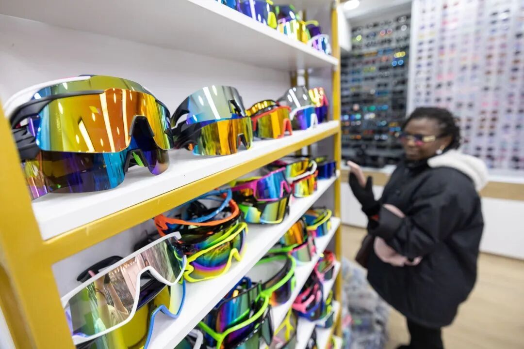 ▲浙江金华义乌中国国际商贸城,一名外籍采购商正在挑选滑雪护目镜