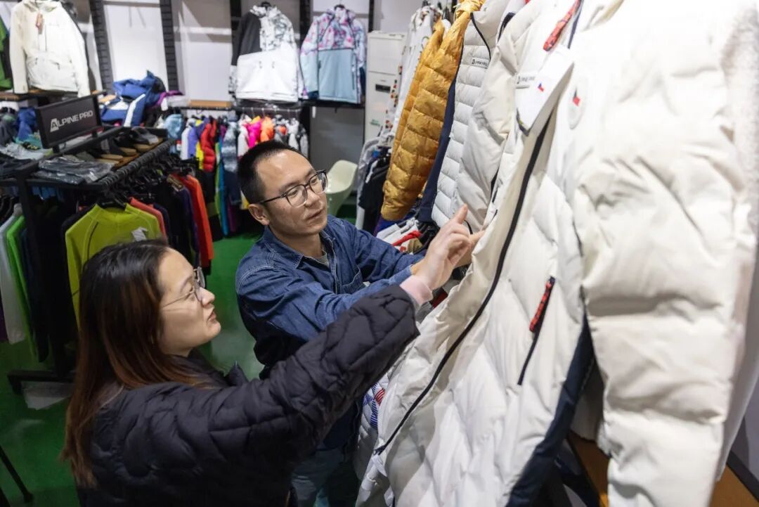 ▲浙江嘉兴,采购商在一家雪服企业上手体验新款雪服