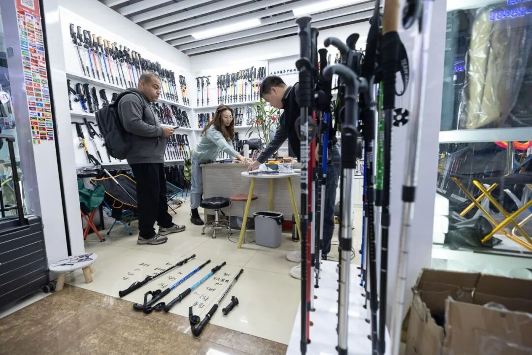 ▲浙江金华义乌中国国际商贸城,外籍采购商在一家陈列着上百款雪杖的商铺里与店主交流