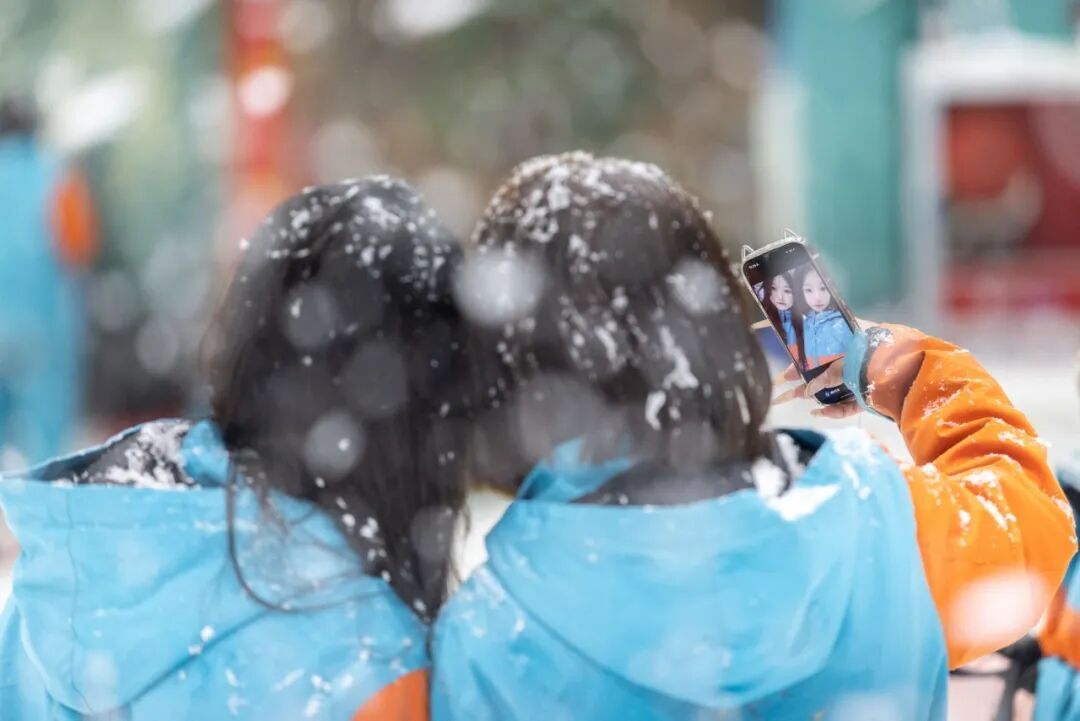 ▲游客在浙江湖州戏雪留影