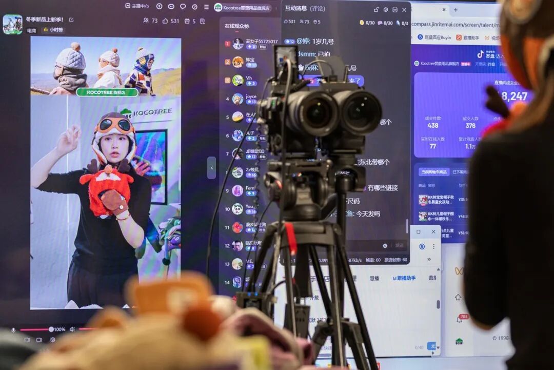 ▲浙江嘉兴桐乡,一名主播在直播间里展示新款儿童滑雪帽