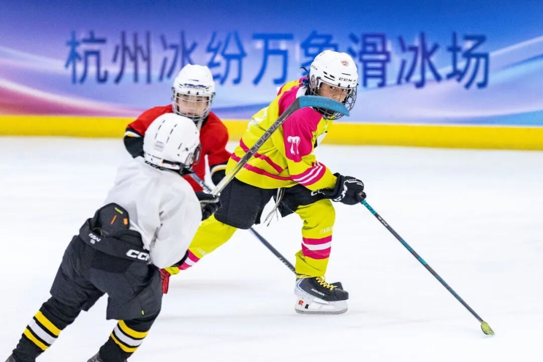 ▲在浙江杭州某大型商圈里,一群孩子在滑冰场上训练冰球